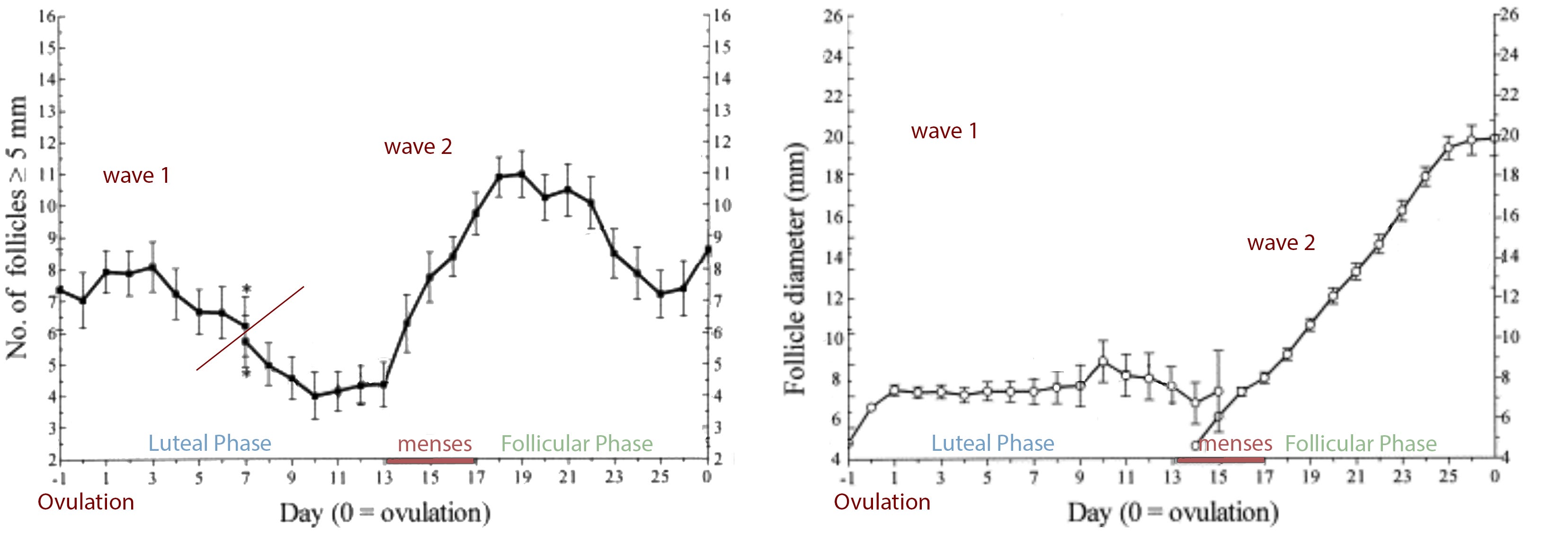 The first wave, which starts right around the time of ovulation, seems to have about 7-8 follicles that grow. The second wave starts… I would say right around the same time as the period. This gets up to about 11 follicles growing at once.